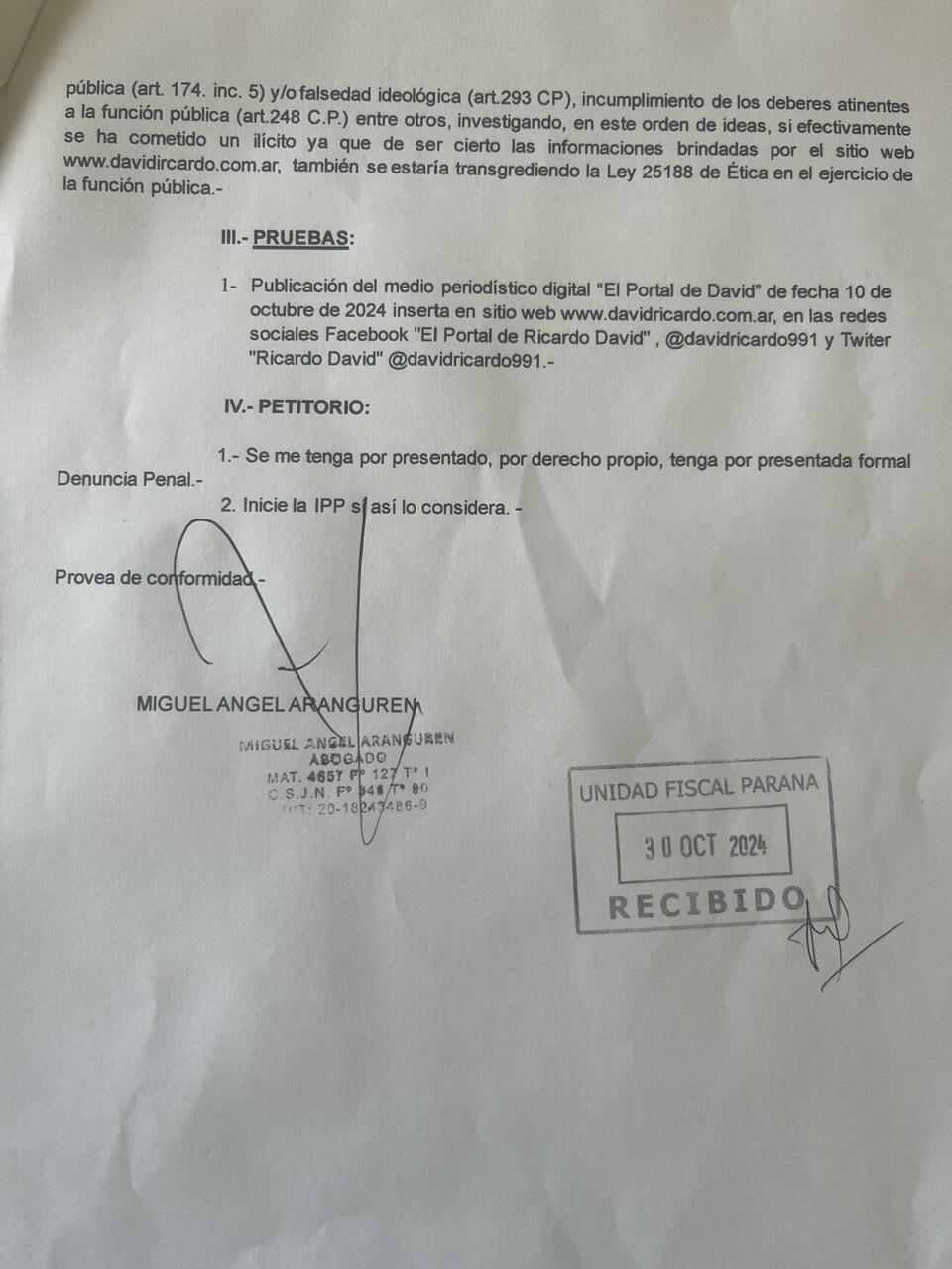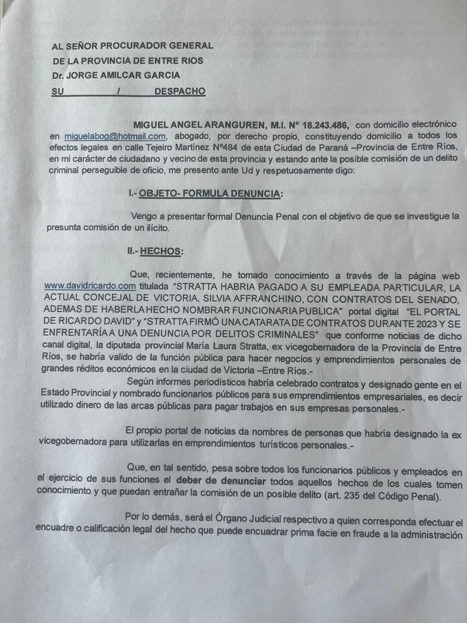 La denuncia, bajo el expediente número 273759 y carátula María Laura Stratta / Negocios incompatibles con la función pública, está dirigida al Procurador General de la Provincia de Entre Ríos, Dr. Jorge Amílcar García. En ella, Aranguren, identificándose como ciudadano y vecino de la provincia, solicita formalmente la apertura de una investigación penal, argumentando que los hechos descritos podrían constituir delitos perseguibles de oficio, dada su relevancia para el interés público.