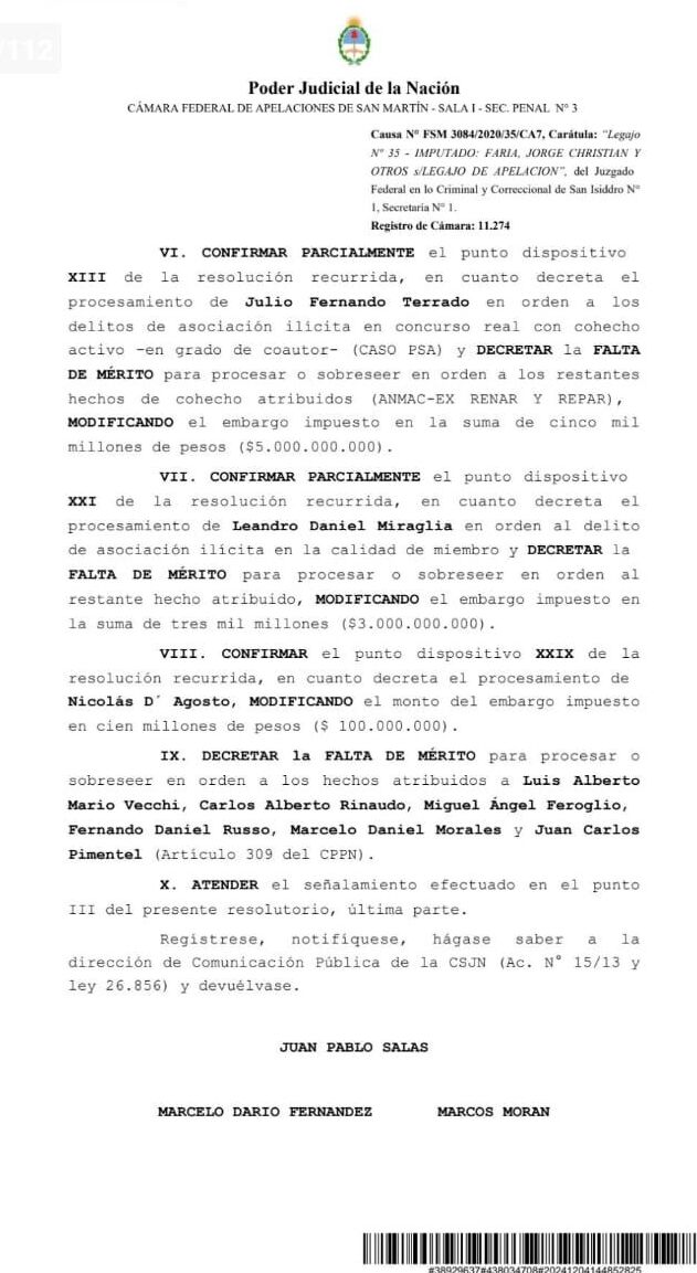 - CONFIRMAR PARCIALMENTE el punto dispositivo XIII de la resolución recurrida, en cuanto decreta el procesamiento de Julio Fernando Terrado en orden a los delitos de asociación ilícita en concurso real con cohecho activo –en grado de coautor– (CASO PSA) y DECRETAR la FALTA DE MÉRITO para procesar o sobreseer en orden a los restantes hechos de cohecho atribuidos (ANMAC-EX RENAR y REPAR), MODIFICANDO el embargo impuesto en la suma de cinco mil millones de pesos ($5.000.000.000).