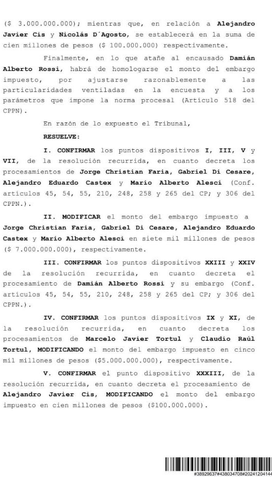 - CONFIRMAR el punto dispositivo XXXIII de la resolución recurrida, en cuanto decreta el procesamiento de Alejandro Javier Cis, MODIFICANDO el monto del embargo impuesto en cien millones de pesos ($100.000.000).