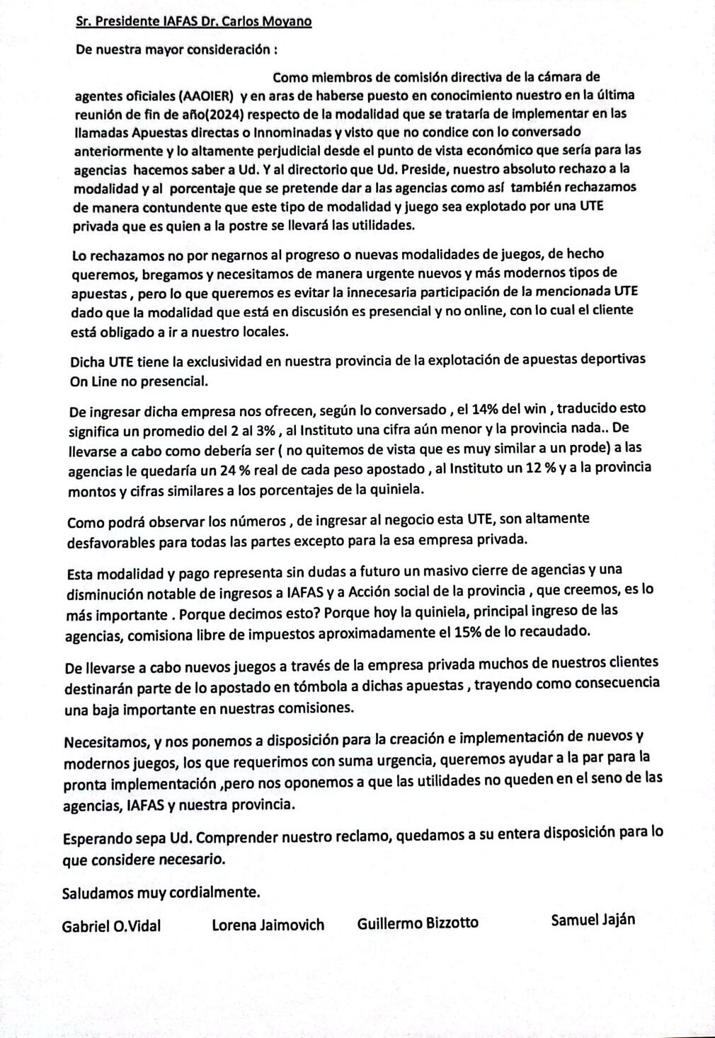 En la carta, los firmantes instaron al Dr. Moyano y al directorio del IAFAS a reconsiderar la propuesta y buscar alternativas que garanticen la sostenibilidad del sector, así como la generación de ingresos para las arcas provinciales. La solicitud se cierra con una invitación al diálogo y a la cooperación para trabajar en un modelo de apuestas que respalde a las agencias oficiales y al desarrollo social de la provincia.