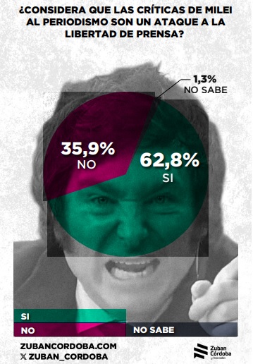 «El 56% cree que cada vez que Milei ataca a los que no piensan como él es porque quiere desviar la atención de la mala situación de la economía, casi el 63% cree, en alguna medida, que las críticas de Milei al periodismo son un ataque a la libertad de prensa y el 67% considera grave que el Presidente “use insultos o un lenguaje agresivo contra periodistas y medios», reza el mencionado informe.
