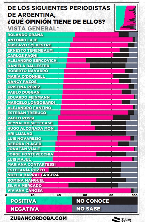 Luis Majul quedó en el puesto 25 y Jonatan Viale en el 23 de un total de 31 periodistas: en los últimos puestos están Romina Manguel, Silvia Mercado y Viviana Canosa. Al mismo tiempo, los comunicadores que resultaron con mayor imagen positiva fueron Rolando Graña, Antonio Laje, Gustavo Sylvestre, Ernesto Tenembaum y Carlos Pagni, en ese orden.