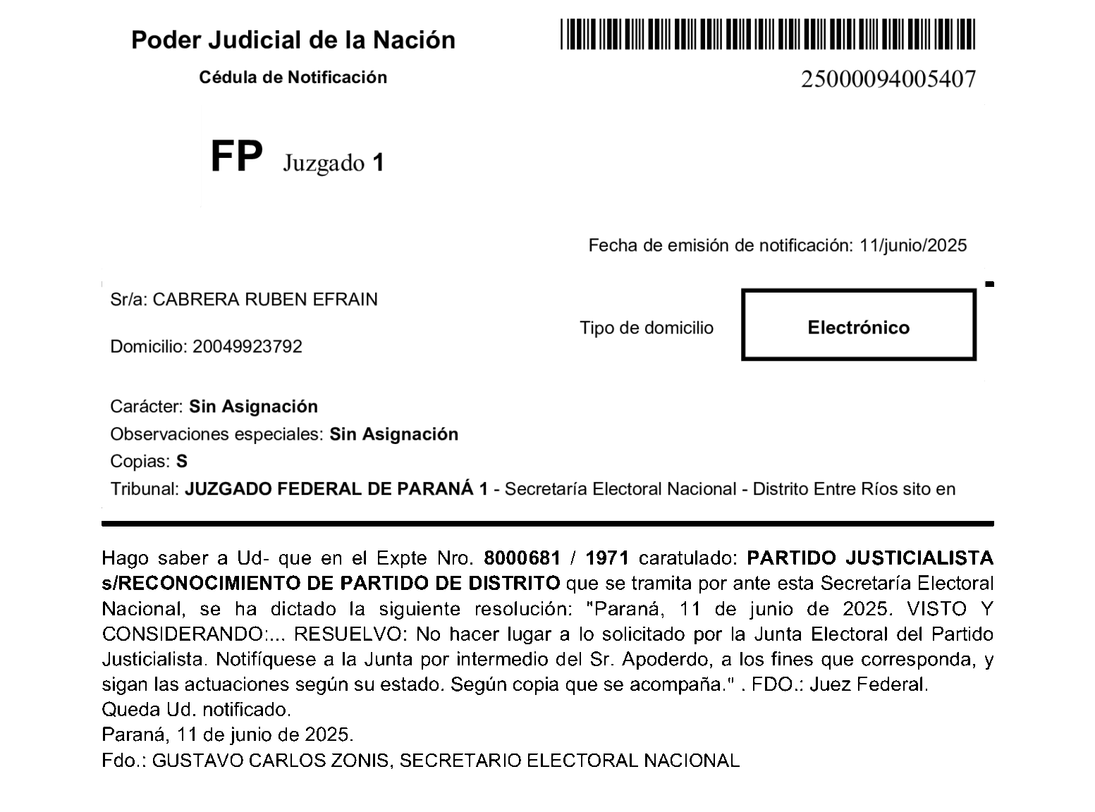 Sin embargo, esta «reserva» no fue considerada una apelación formal por el Juzgado Federal. En la resolución judicial emitida hoy, con fecha del 11 de junio, el juez a cargo del expediente N° 8000681/1971 explica que el procedimiento legal no fue cumplido.