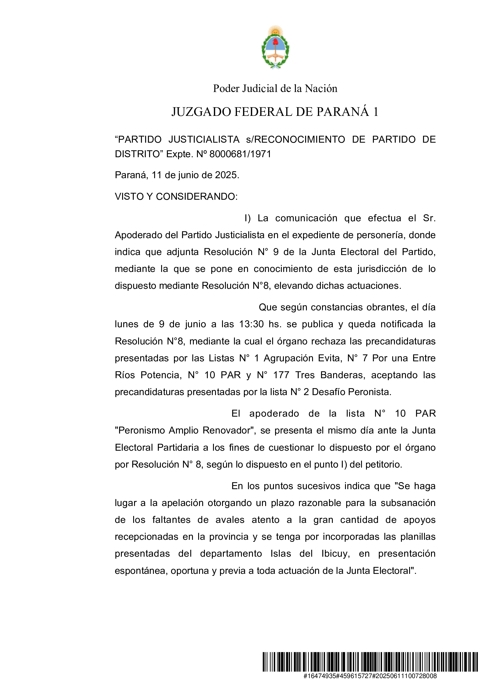 Tras la notificación, el apoderado de la lista N° 10 «PAR» presentó un escrito ante la misma Junta Electoral partidaria cuestionando la decisión. En el documento, solicitaban un plazo para subsanar la falta de avales y pedían que se tuvieran por válidas planillas del departamento Islas del Ibicuy. Crucialmente, el escrito finalizaba indicando que, en caso de no obtener una respuesta favorable, «se da por agotada la instancia administrativa y hacemos reserva a acudir a la justicia».