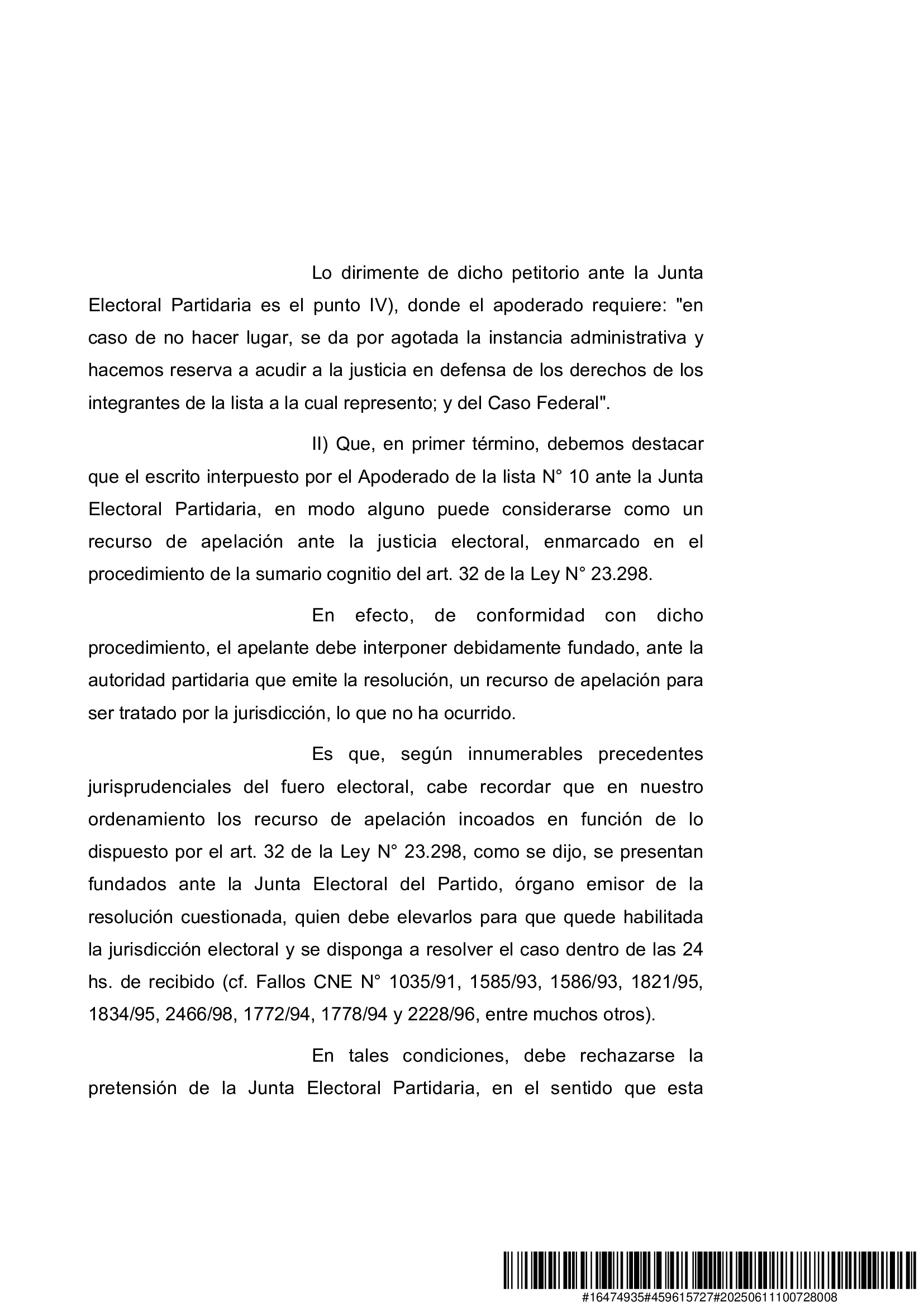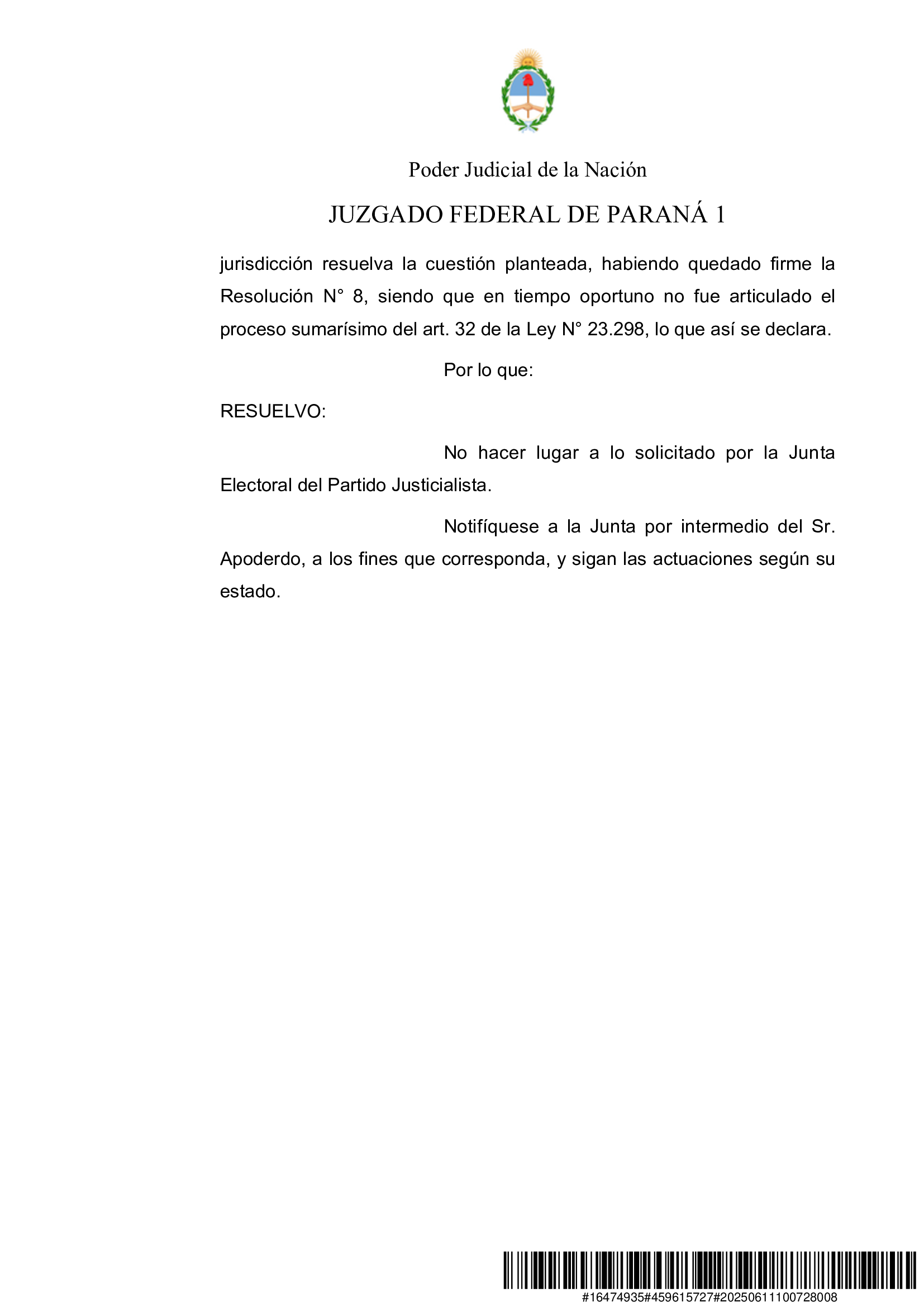 «En tales condiciones, debe rechazarse la pretensión de la Junta Electoral Partidaria, en el sentido que esta jurisdicción resuelva la cuestión planteada, habiendo quedado firme la Resolución N° 8, siendo que en tiempo oportuno no fue articulado el proceso sumarísimo del art. 32 de la Ley N° 23.298», concluye la resolución judicial.