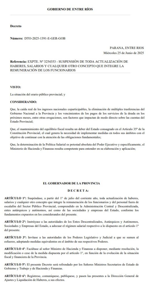 La medida, según el decreto, proviene de “la caída de los ingresos nacionales coparticipables la eliminación de múltiples trasferencias del Gobierno Nacional a la Provincia y los vencimientos de los pagos de los servicios de la deuda en los próximos meses impactan de modo directo sobre las cuentas del Estado Provincial”.