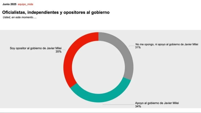 Así lo señaló un relevamiento de la consultora Equipo Mide, realizado a nivel nacional a mediados de junio pasado. Según mostró, la sociedad argentina se encuentra dividida en tres tercios respecto al gobierno de Javier Milei. Un 35% de los consultados se manifiesta opositor al actual gobierno, mientras que un 34% lo apoya activamente. En tanto, un 31% declara no apoyar ni oponerse, ubicándose en una posición intermedia o independiente.