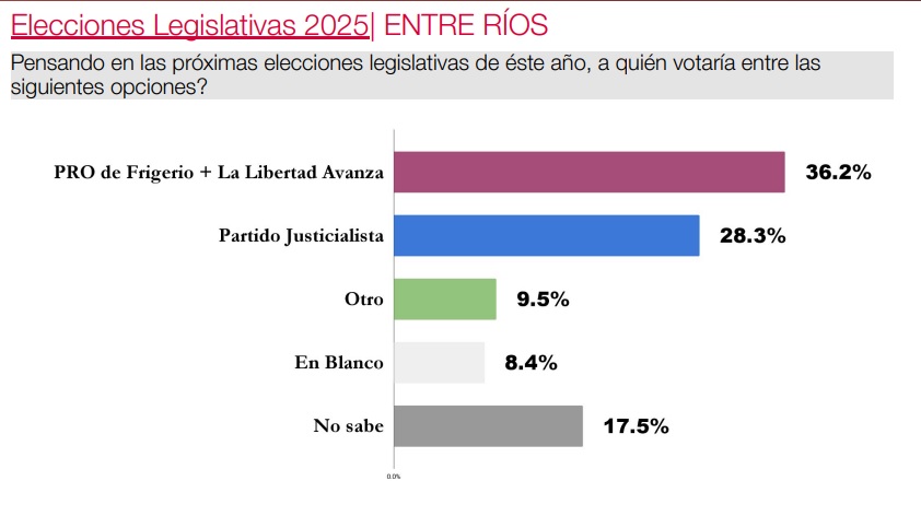 Entre Ríos: PRO de Frigerio + La Libertad Avanza 36,2%, Partido Justicialista 28,3% y Otro 9,5%.
