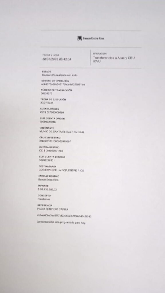 “Hoy 30/07, la Municipalidad de Santa Elena pagó una cuota más de la deuda que dejó la gestión de Silvio Moreyra. En esta ocasión la cuota abonada fué de $91.438.785,62” expresó el intendente Rossi.