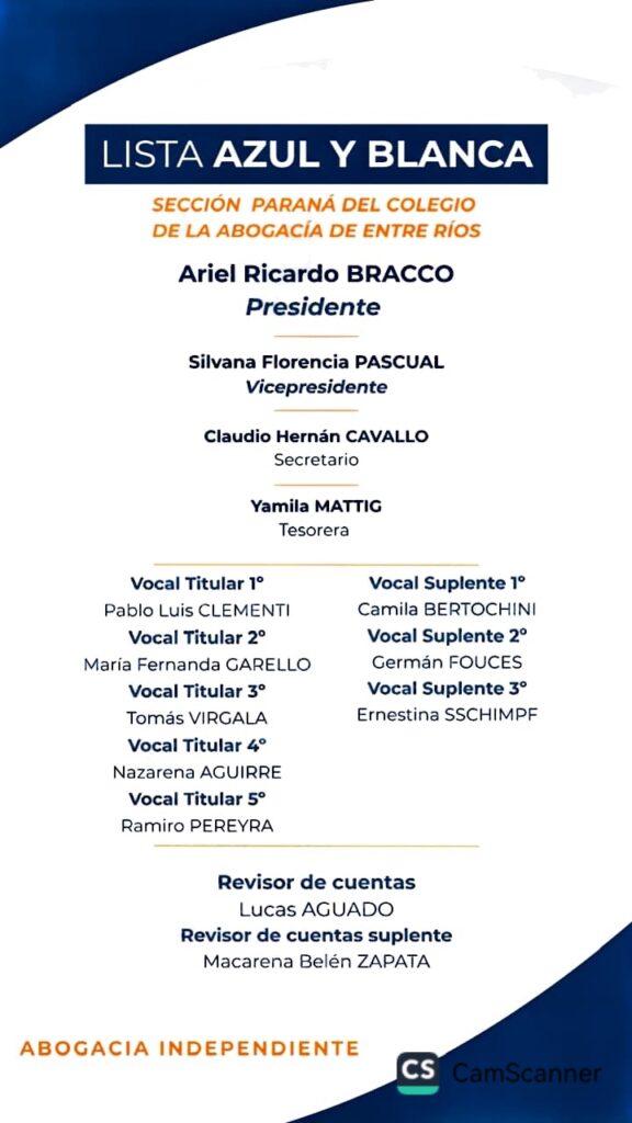 Ariel Bracco está al frente de la Lista Azul y Blanca Abogacía Independiente; lo acompañan como postulante a vicepresidenta Silvana Florencia Pascal. En tanto, como candidato a secretario va Claudio Hernán Cavallo; y como candidata a tesorera, Yamila Mattig.