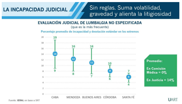 Según un informe de IERAL de Fundación Mediterránea, la lumbalgia (una de las afecciones más frecuentemente diagnosticadas en la justicia) luego de ser valoradas sin incapacidad en Comisiones Médicas, suelen promediar, según los peritos judiciales, un14% incapacidad definitiva. Si bien ese es el promedio hay una amplia variabilidad, no sólo entre provincias sino dentro de cada jurisdicción.