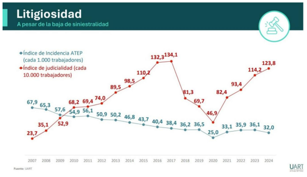 Argentina registra uno de los índices más altos de litigios por riesgos del trabajo, con una tasa de judicialidad que es 15 veces la de España y 21 veces la de Chile, a pesar de tener mayores prestaciones y una accidentabilidad similar.