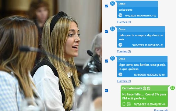 De acuerdo a los documentos consultados por Infobae, Ornella Calvete avisó a su padre, Miguel Ángel Calvete, sobre la presencia de la policía en la planta baja de su vivienda el 12 de septiembre de 2025. Mediante un mensaje, le expresó: “No sé si es por el cabeza de rodilla o qué”. Apenas intercambiaron saludos, la funcionaria señaló que se trató de una falsa alarma, aunque continuó la charla refiriéndose a stickers y bromas personales. En el mismo diálogo, el padre le aconsejó seguir instrucciones y abordó temas vinculados a la situación financiera de la firma INDECOM y la disponibilidad de “cash blanco”. El dictamen fiscal mostró que, en esa conversación, Miguel Ángel Calvete sugirió qué responder si le preguntaban por el dinero: “por si entran acá y me ven con mossca” o “digo que me lo prestó alguien, olvidate”.