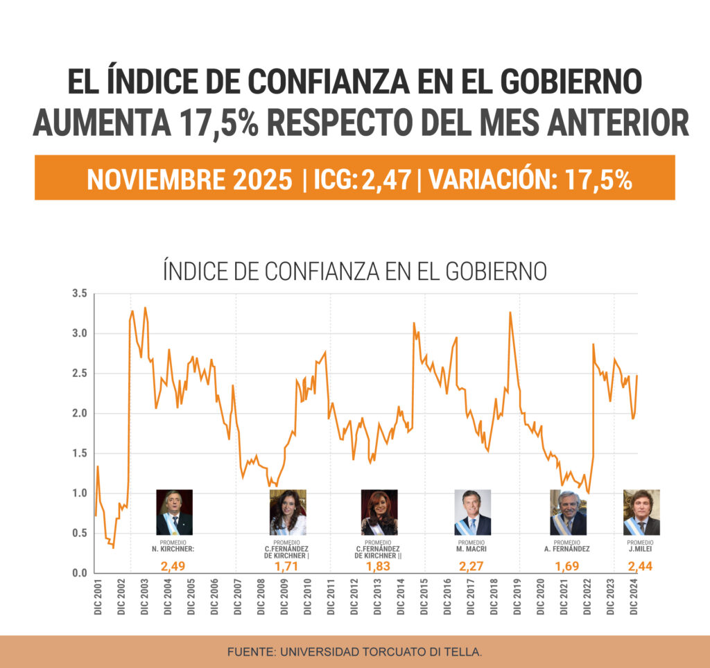 El Índice de Confianza en el Gobierno (ICG), elaborado por la Escuela de Gobierno de la Universidad Torcuato Di Tella, registró en noviembre de 2025 un valor de 2,47 puntos, lo que representa un aumento del 17,5% respecto del mes anterior. Este repunte, que compensa las caídas observadas en agosto y septiembre, sitúa al indicador en su nivel más alto desde febrero de este año, cuando alcanzó los 2,56 puntos. El relevamiento, realizado por Poliarquía Consultores entre el 3 y el 14 de noviembre, refleja el clima de opinión pública nacional tras las elecciones de octubre, en las que se impuso La Libertad Avanza.