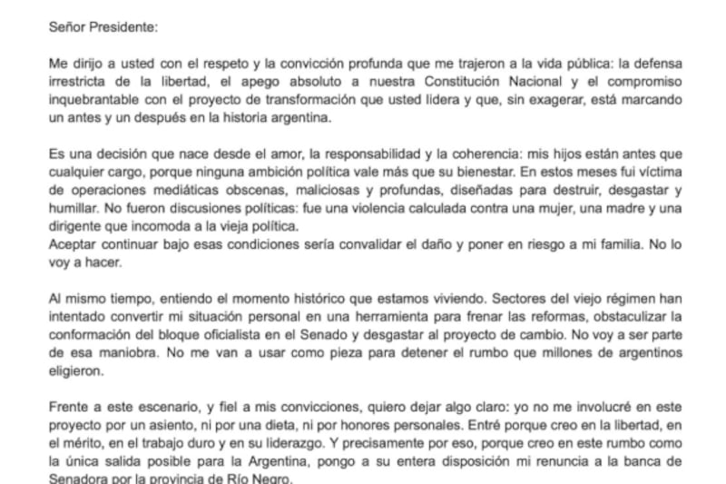 Lorena Villaverde, legisladora de La Libertad Avanza y senadora electa por Río Negro, presentó este miércoles su renuncia a la banca en el Senado antes de jurar. En su carta al presidente de la Nación, Javier Milei, explicó que la decisión busca evitar ser “usada como herramienta para dañar al gobierno”, en medio de lo que calificó como “operaciones mediáticas” en su contra.