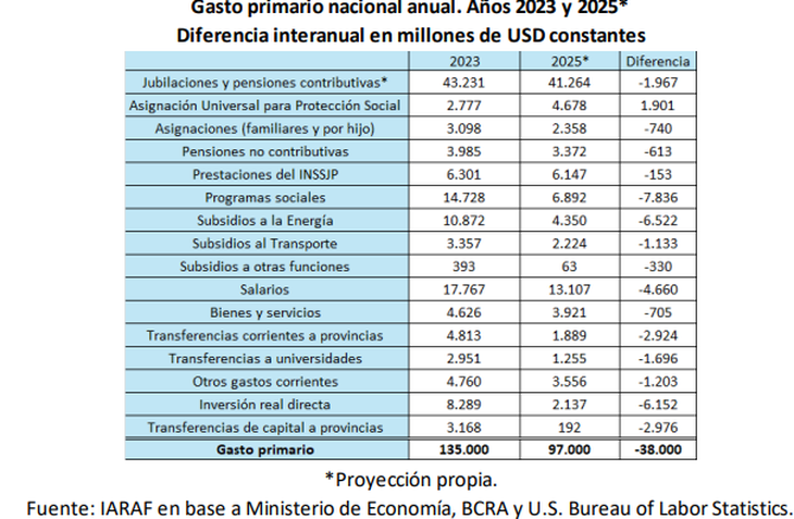 El IARAF señala que “el gasto primario nacional anual de 2025 tendría un descenso de $50 billones en moneda de noviembre de 2025, en comparación con el gasto realizado en 2023”. “En términos de variación porcentual, la caída sería del 27%, es decir, del orden de la cuarta parte”, señala el informe.