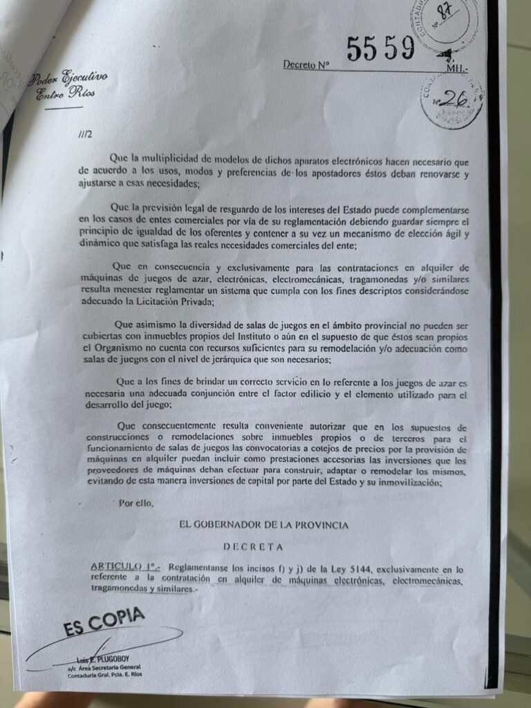 En el derecho administrativo, las excepciones suelen justificarse por situaciones de emergencia o necesidades extremas de agilidad. Sin embargo, en el ámbito del juego de azar en Entre Ríos, la excepción dejó de ser un recurso extraordinario para convertirse en una estructura permanente que desafía los principios republicanos de control. El Decreto 5559/02, que habilita al Instituto de Ayuda Financiera a la Acción Social (IAFAS) a alquilar máquinas tragamonedas mediante licitaciones privadas sin límite de monto, representa hoy un contraste alarmante frente a la política de transparencia que el Estado provincial dice promover.