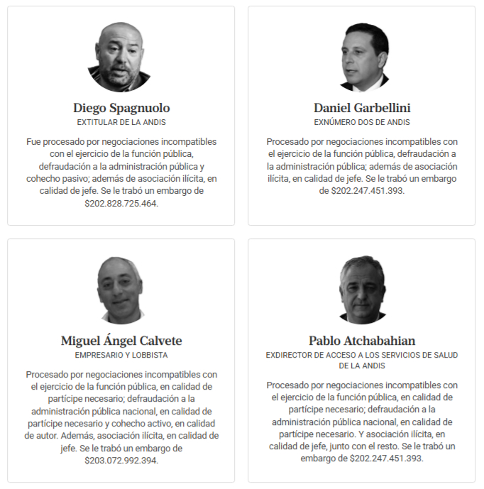 En total, los procesados por Casanello fueron 19. A todos, además, les embargó sus bienes. El embargo más alto fue el de Spagnuolo, de 202.828.725.464 pesos. La lista de los procesados incluye a exfuncionarios y empleados de la Andis y a privados que intervinieron, casi todos, con distintos roles en la asociación ilícita que se infiltró en la Agencia.