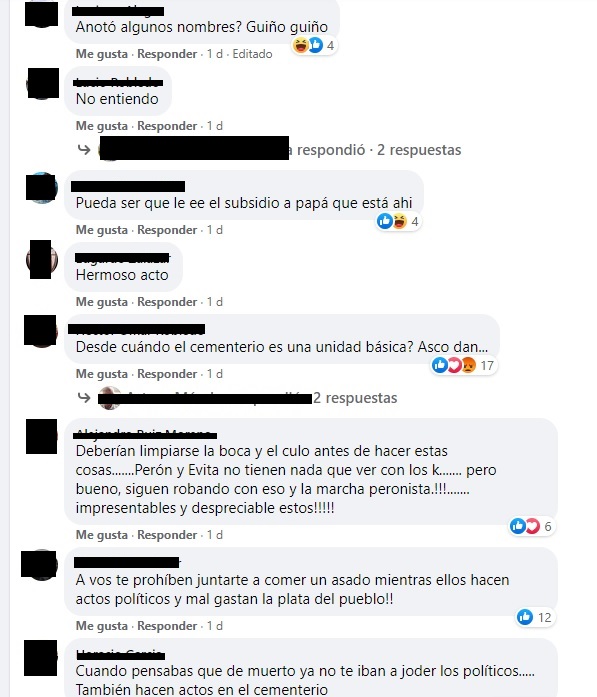 Al tratarse de un acto en el cementerio, hubo quien preguntó si la vicegobernadora “anotó algún nombre”, quien conjeturó que el subsidio de su padre podría estar allí y quien directamente aseguró irónicamente que Stratta fue a ese lugar a llevar subsidios.