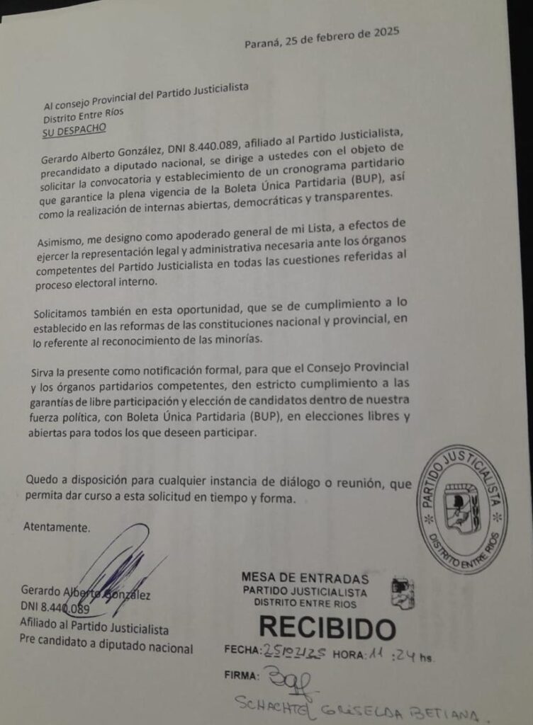 González, afiliado al Partido Justicialista y lanzado como precandidato a Diputado Nacional, solicitó al PJ Entre Ríos que también garantice la plena vigencia de la Boleta Única Partidaria y la realización de internas dentro del peronismo.