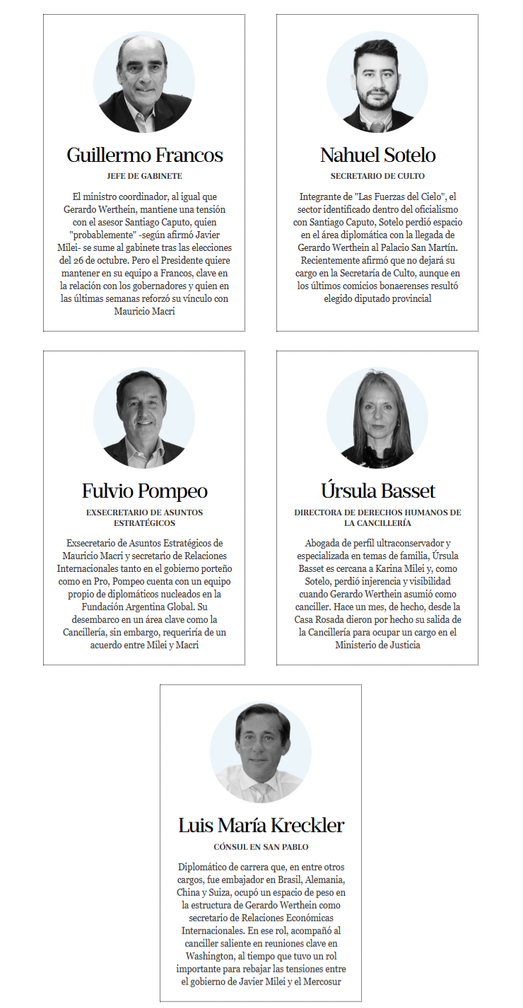 En tanto, el ex canciller había sido nombrado en su cargo como reemplazo de Diana Mondino, la funcionaria que fue echada por el voto a favor de Cuba en una Asamblea de la ONU. Ningún integrante de la plana mayor había salido hasta esta fecha. Es por ese motivo que el ministro ejecutó una política exterior estricta y sumida al alineamiento de Argentina con Estados Unidos e Israel, llevando a cabo esos movimientos en las votaciones en los ámbitos multilaterales en donde participa el país.